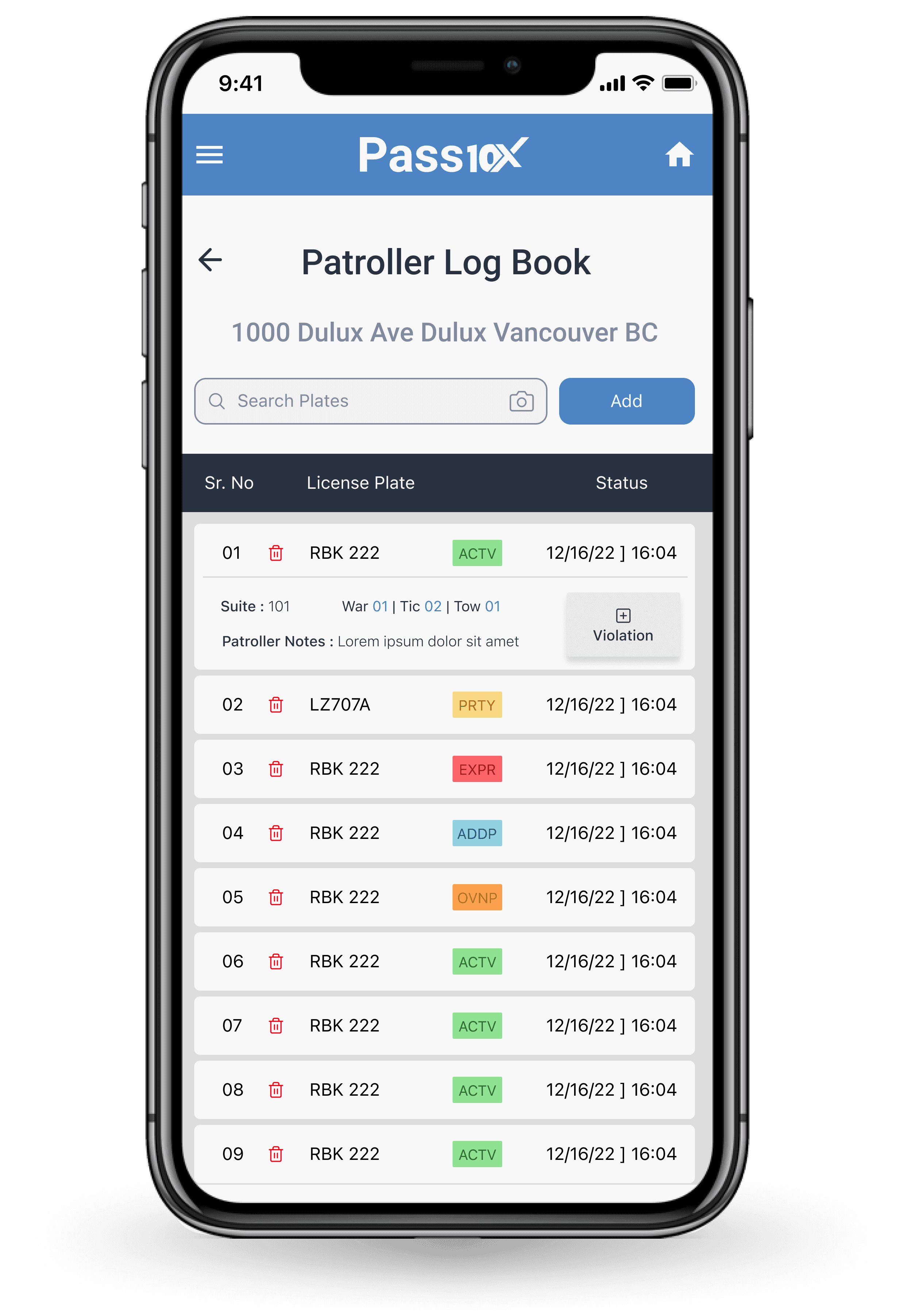 Full featured patrol module that tracks pass activity, issues violations with history.